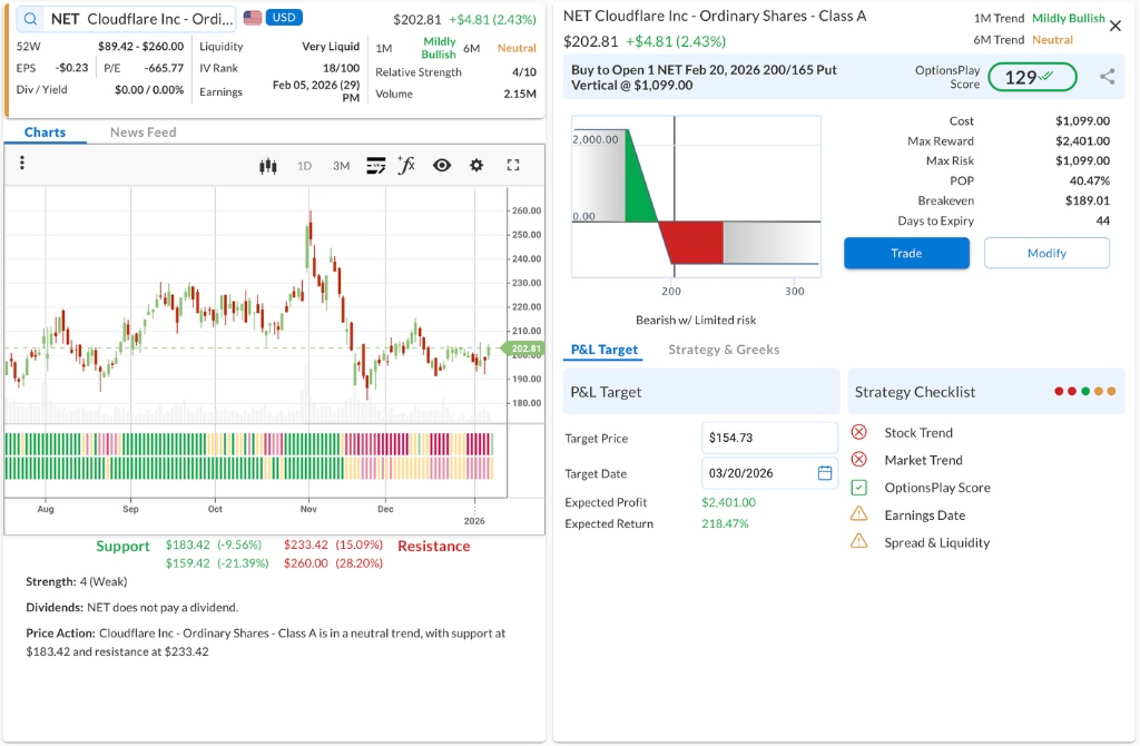 • The Trade: Buy to Open the NET Feb 20, 2026 200/165 Put Vertical @ $10.99 Debit.