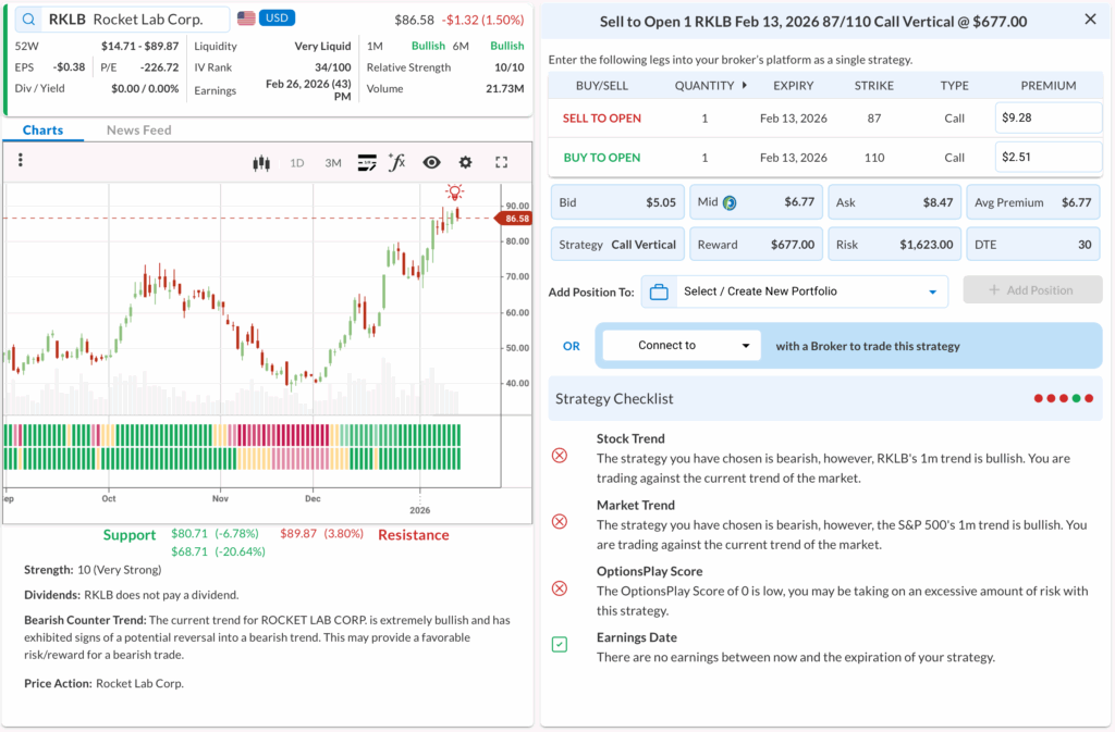 • The Trade: Sell to Open the RKLB Feb 13, 2026 87/110 Call Vertical @ $6.77 Credit.