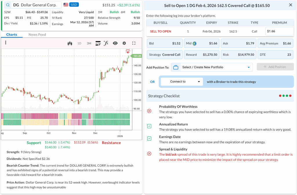 • The Why: We are utilizing high implied volatility to generate income on Dollar General, creating a buffer against technical resistance and macro consumer headwinds.
