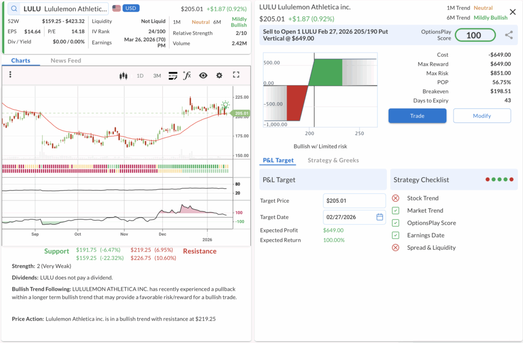• The Trade: Sell to Open the LULU Feb 27, 2026 205/190 Put Vertical @ $6.49 Credit.