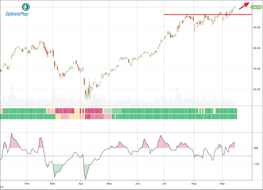 The stock has decisively cleared the $97 resistance level, which is now acting as firm support, while maintaining strength above the 20-day, 50-day, and 200-day moving averages, an alignment that confirms the prevailing uptrend. Momentum indicators are also supportive, with the RSI holding in the mid-60s, signaling steady buying interest without reaching overbought territory. This combination of technical strength and healthy momentum reinforces the bullish setup and points to further upside potential.