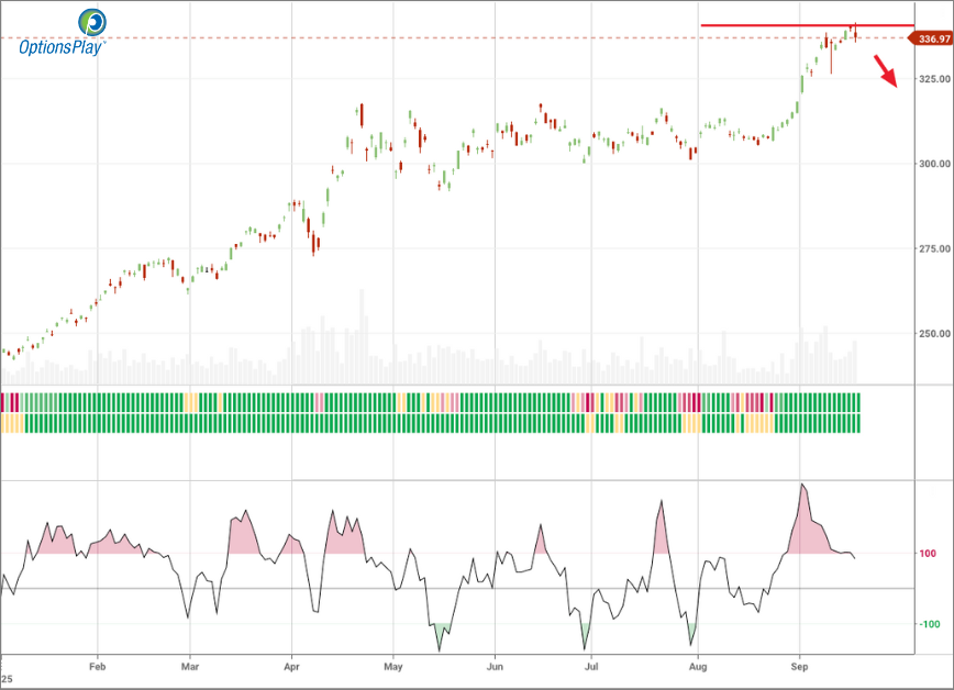 GLD is trading near all-time highs just below $341 after a parabolic upside move, suggesting exhaustion risk. The ETF’s RSI stands at 72.85, firmly in overbought territory. Notably, within the options play platform yesterday, a “Bearish Counter Trend” alert was generated, highlighting that GLD has been extremely bullish but is now exhibiting signs of a potential reversal into a bearish trend. Key downside levels include the 20-day moving average near $325 as an initial trigger, followed by the 50-day moving average around $315 and the 200-day at $287. A sustained break below $325 would confirm downside momentum, with an upside resistance existing near the recent all-time high around $341.