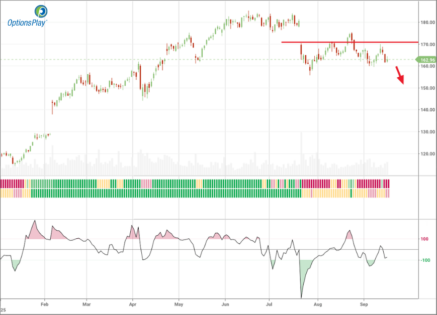 Philip Morris International (PM) is showing signs of weakness as both technical and fundamental dynamics point to a more challenging backdrop. While the company remains a global leader in reduced-risk products and traditional tobacco, its elevated valuation and margin pressures leave little room for error. With price action stalling and momentum indicators rolling over, downside risks appear to be gaining traction. Against this backdrop, a defined-risk options strategy provides an efficient way to express a bearish view while limiting capital at risk.