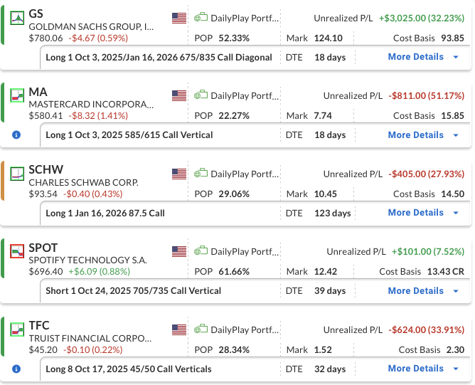 Bullish Debit Spread – Mastercard Incorporated (MA) – We initially entered this position with a straight long call due to the very low IV rank of 6/100, which made spreads less attractive. The position has moved lower with the financial sector, and with less than 30 days to expiration, we converted to a bull call spread last week by adding a short option to reduce risk while retaining meaningful upside. This adjustment limits potential gains on a sharp breakout but keeps the trade aligned with our bullish outlook.