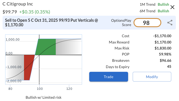 To express a bullish view on Citigroup (C), we recommend selling the Oct 31, 2025 $99/$93 put vertical spread for a net credit of $2.34. This involves selling the $99 put and buying the $93 put, resulting in a maximum potential profit of $234 per spread if C remains above $99 at expiration. The maximum risk is capped at $366 per spread, creating a favorable risk/reward setup where the trade yields a return of roughly 64% on risk if C holds above the short strike.