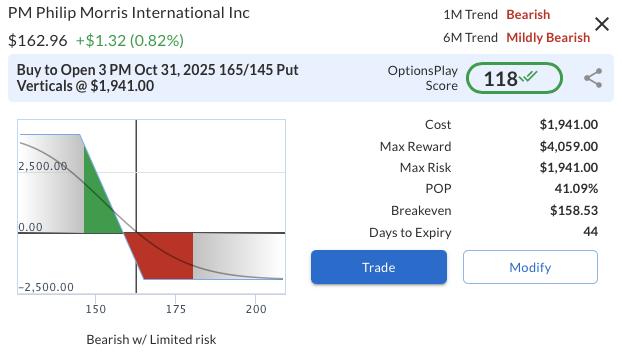 A put vertical spread offers defined risk and favorable leverage to the downside. The suggested trade is to buy the Oct 31, 2025 $165 put and sell the $145 put for a net debit of $6.47 ($647 per spread). This structure risks $647 while offering a maximum reward of $1,353 if PM closes at or below $145 at expiration. The reward-to-risk ratio of roughly 2.1:1 makes the setup attractive. This approach provides efficient bearish exposure without the unlimited risk of outright shorting.