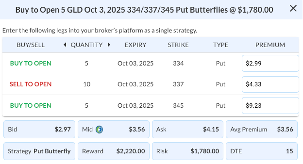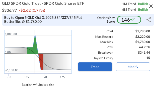 A tactical bearish expression can be structured with a GLD Oct 3, 2025, 334/337/345 Put Butterfly entered at a $356 debit. This is a non-standard butterfly, often referred to as an Open-Wing Butterfly, where the long spread is 8 points wide and the short spread is 3 points wide, which creates profitability not only near the $337 strike but also anywhere below the $334 put strike at expiration. The maximum potential reward is $444, with risk capped at the $356 cost. This structure aligns with the view that GLD may retrace sharply from overbought levels, offering attractive asymmetric exposure to downside while containing risk through defined premium outlay.