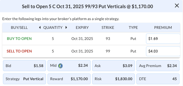 Details: Sell to Open 5 C Oct 31 $99/$93 Put Vertical Spreads @ $2.34 Credit per Contract.