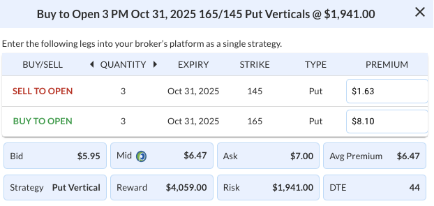 Details: Buy to Open 3 PM Oct 31 $165/$145 Put Vertical Spreads @ $6.47 Debit per Contract.