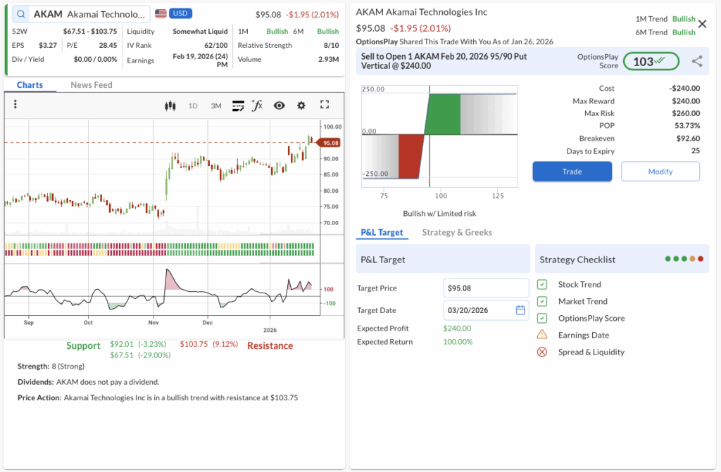 - The Trade:Sell to Open the AKAM Feb 20 2026 95/90 Put Vertical @ $2.40 Credit.