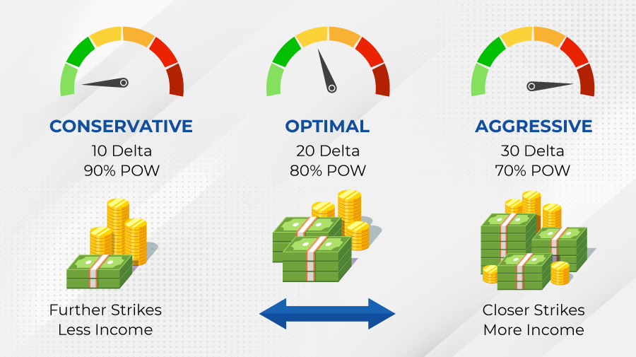 The selection of a suitable strike price can be optimized by using Delta. Delta represents an approximation of the probability that the stock price will stay below the strike price. The lower the Delta, the lower the premium received and the higher the probability of the shares not being called away.